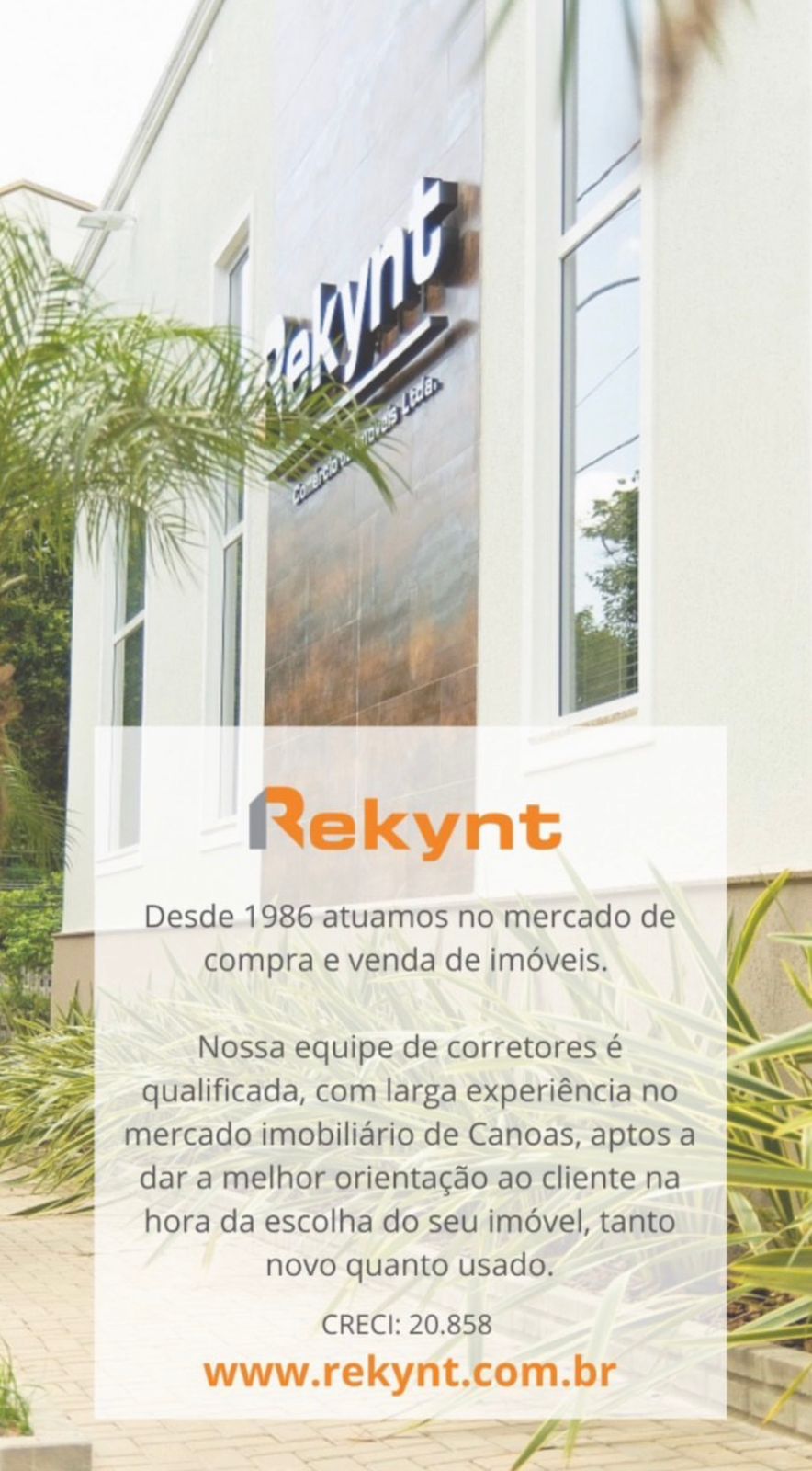 A Rekynt Imóveis, desde 1986, atua no mercado imobiliário na cidade de Canoas/RS., fez parte do crescimento do município, com idéias, lançamentos de diversos empreendimentos, consultoria e gestão de vários imóveis.